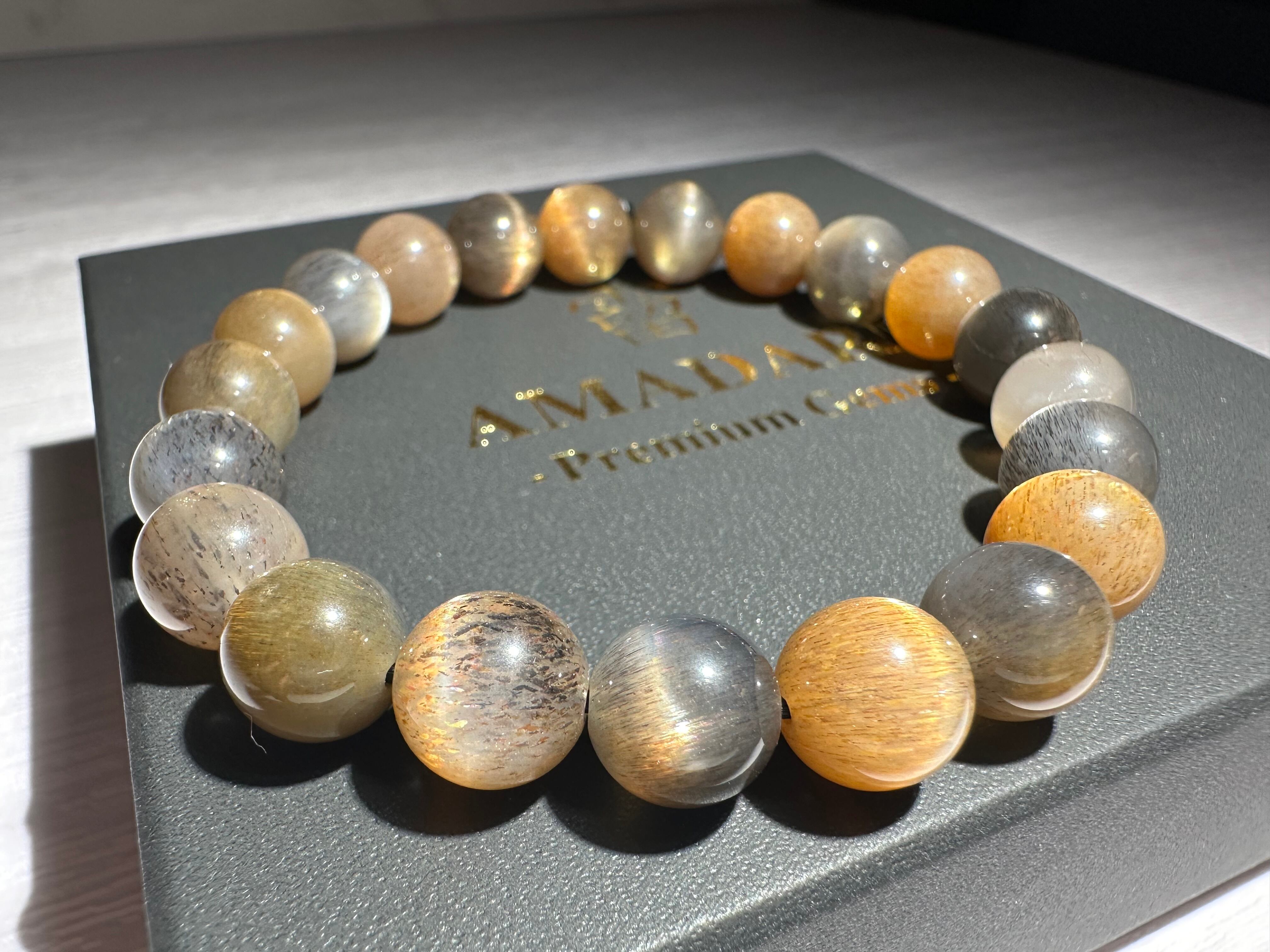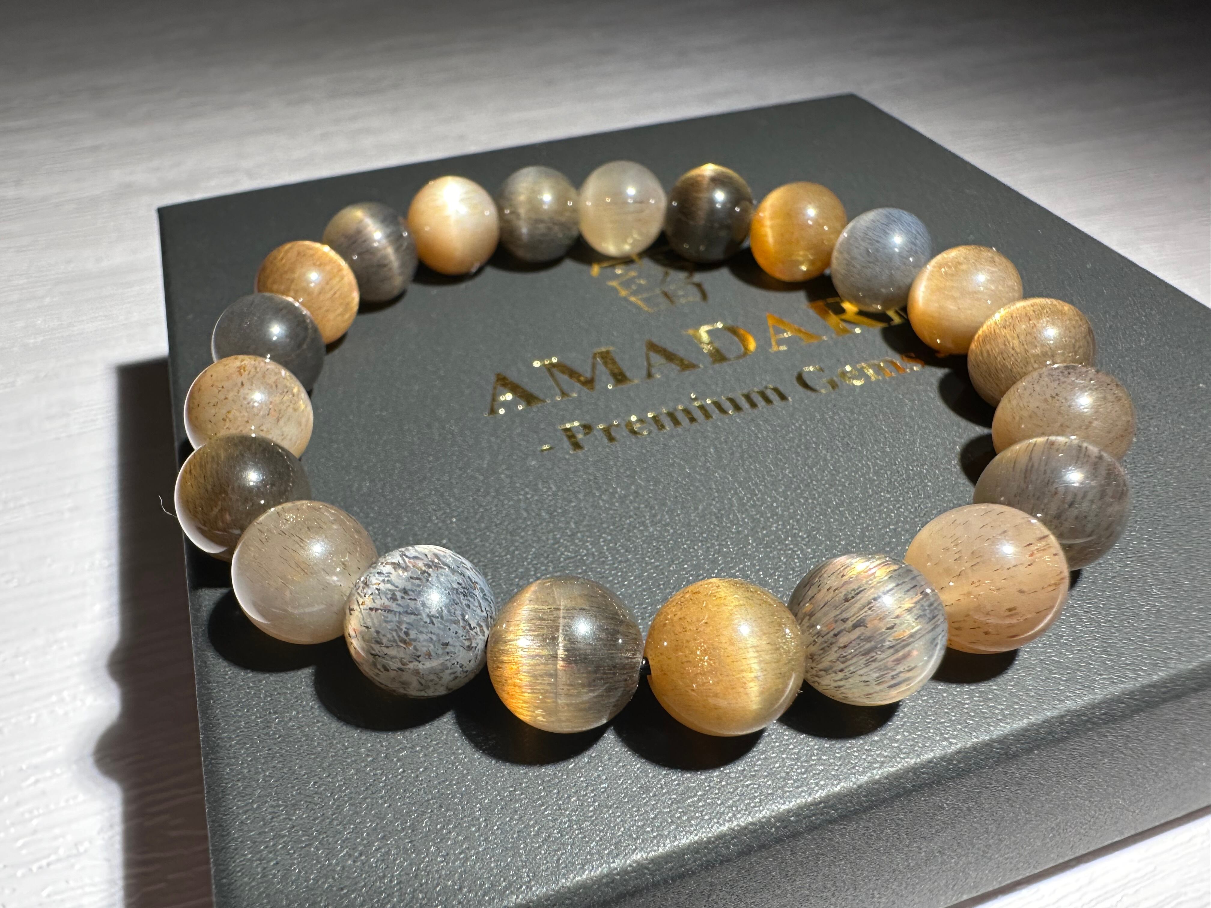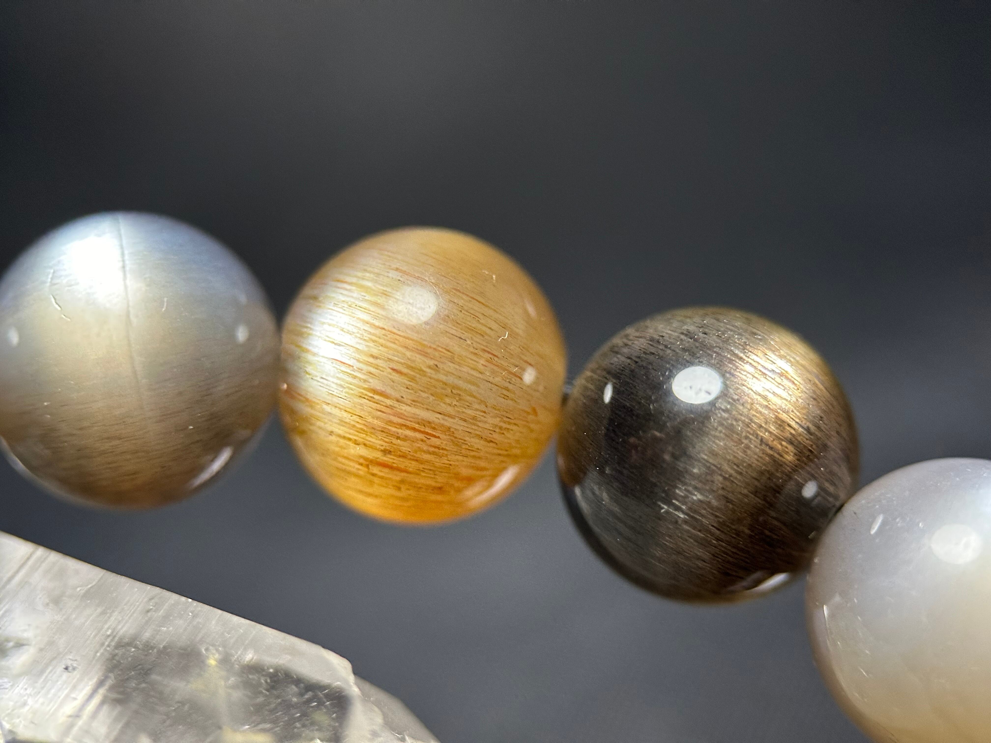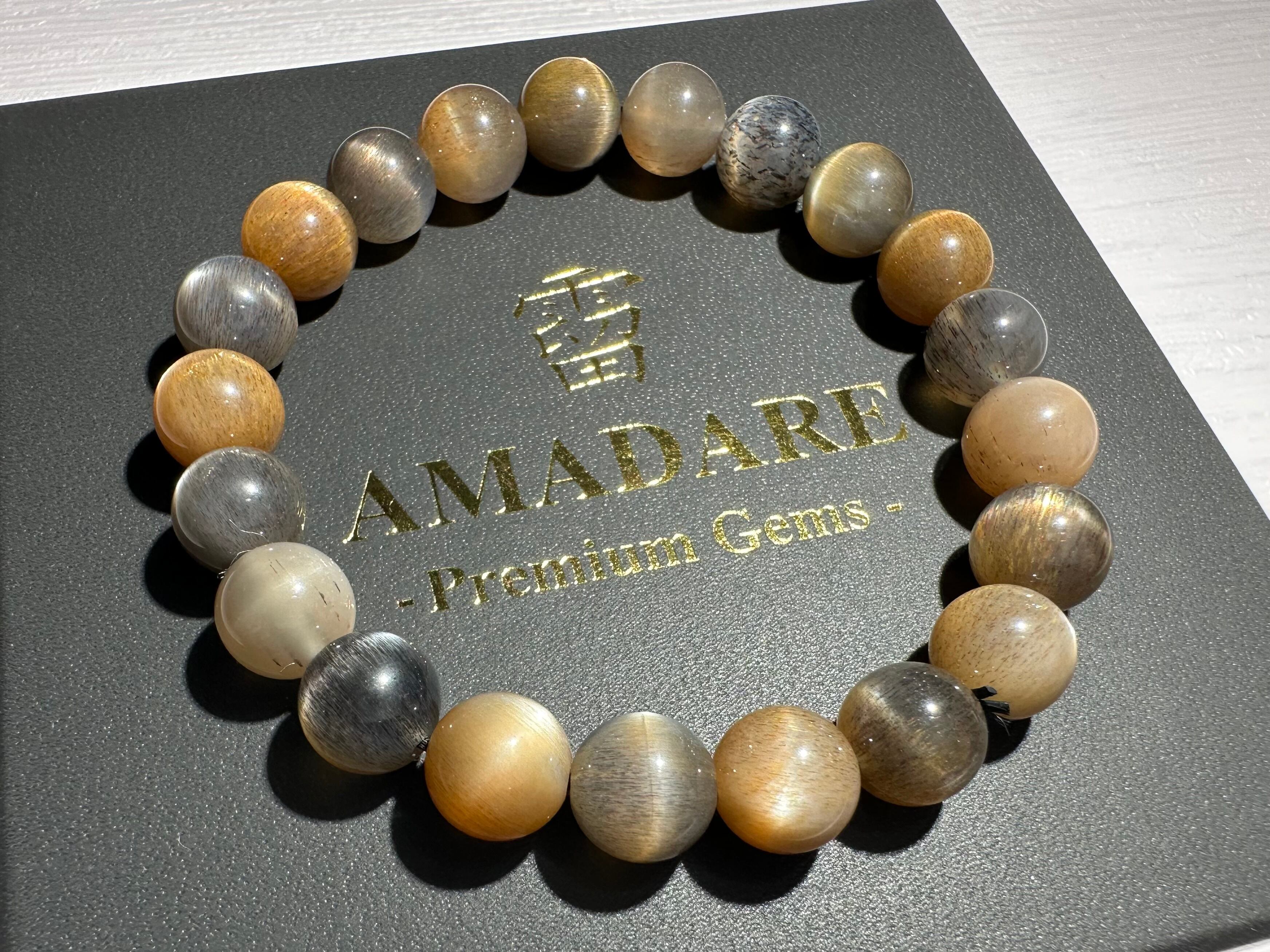 ブラックカラーやゴールド、グレーといった様々なカラーのサンストーンで仕立てられています。