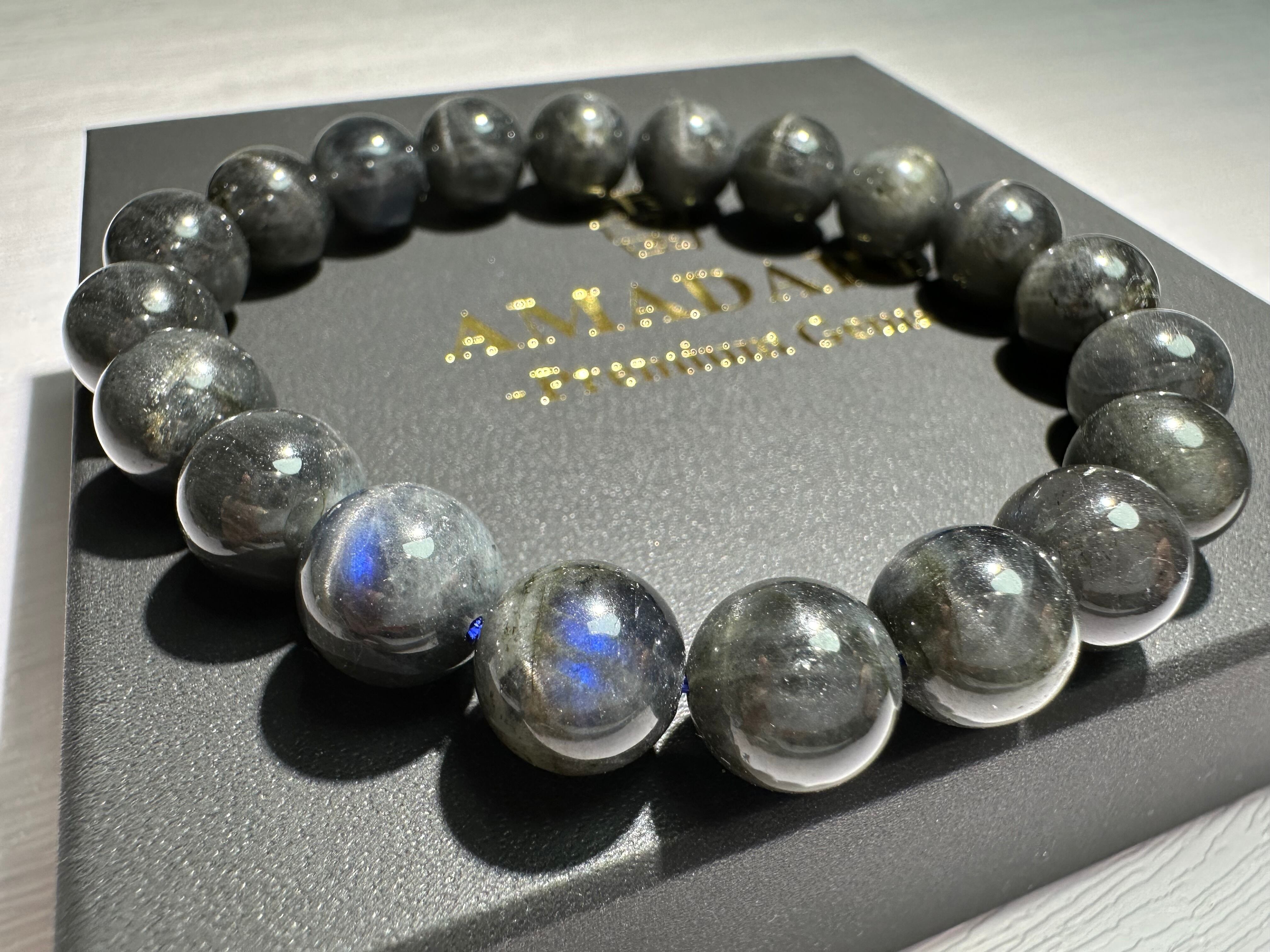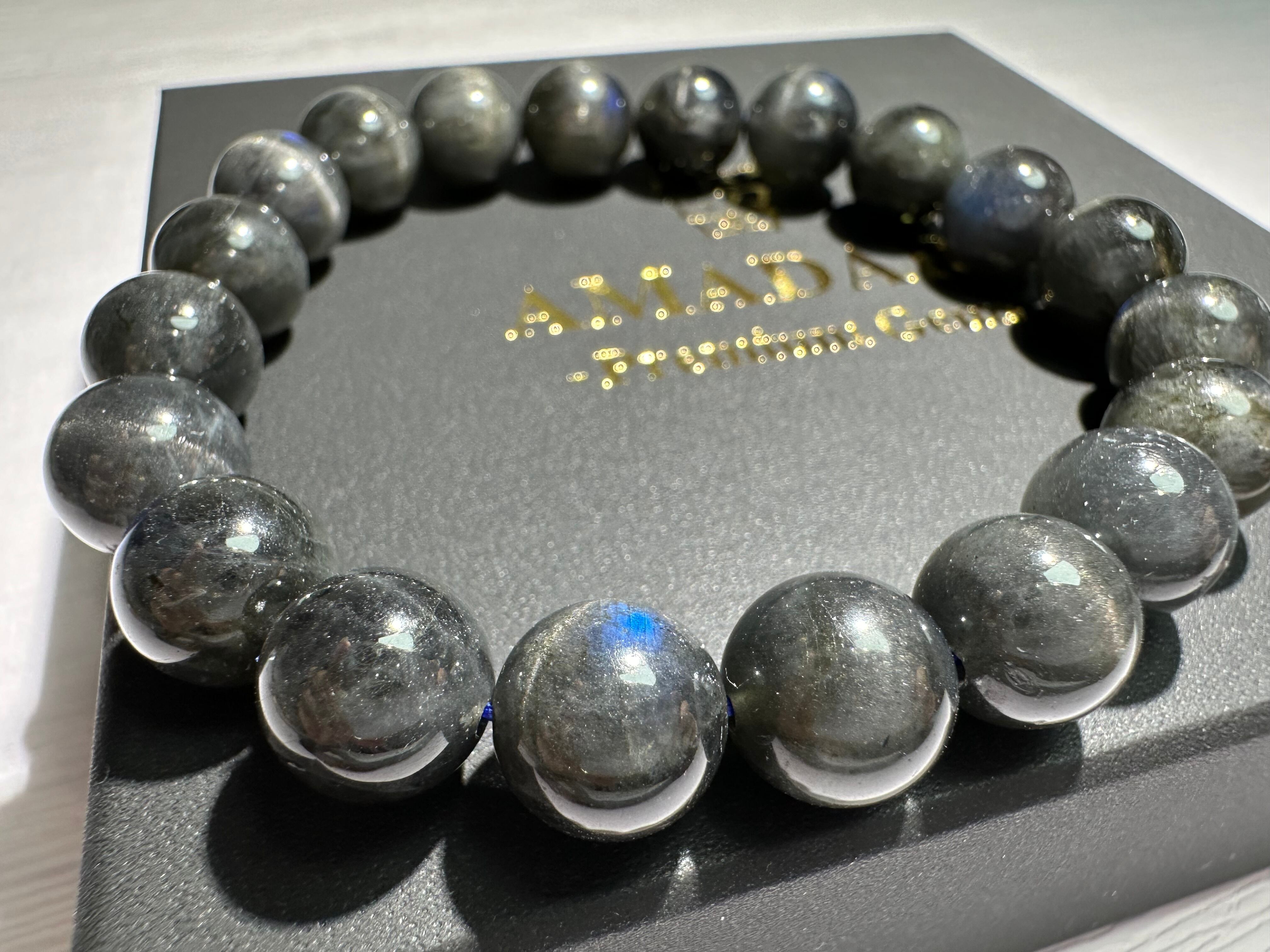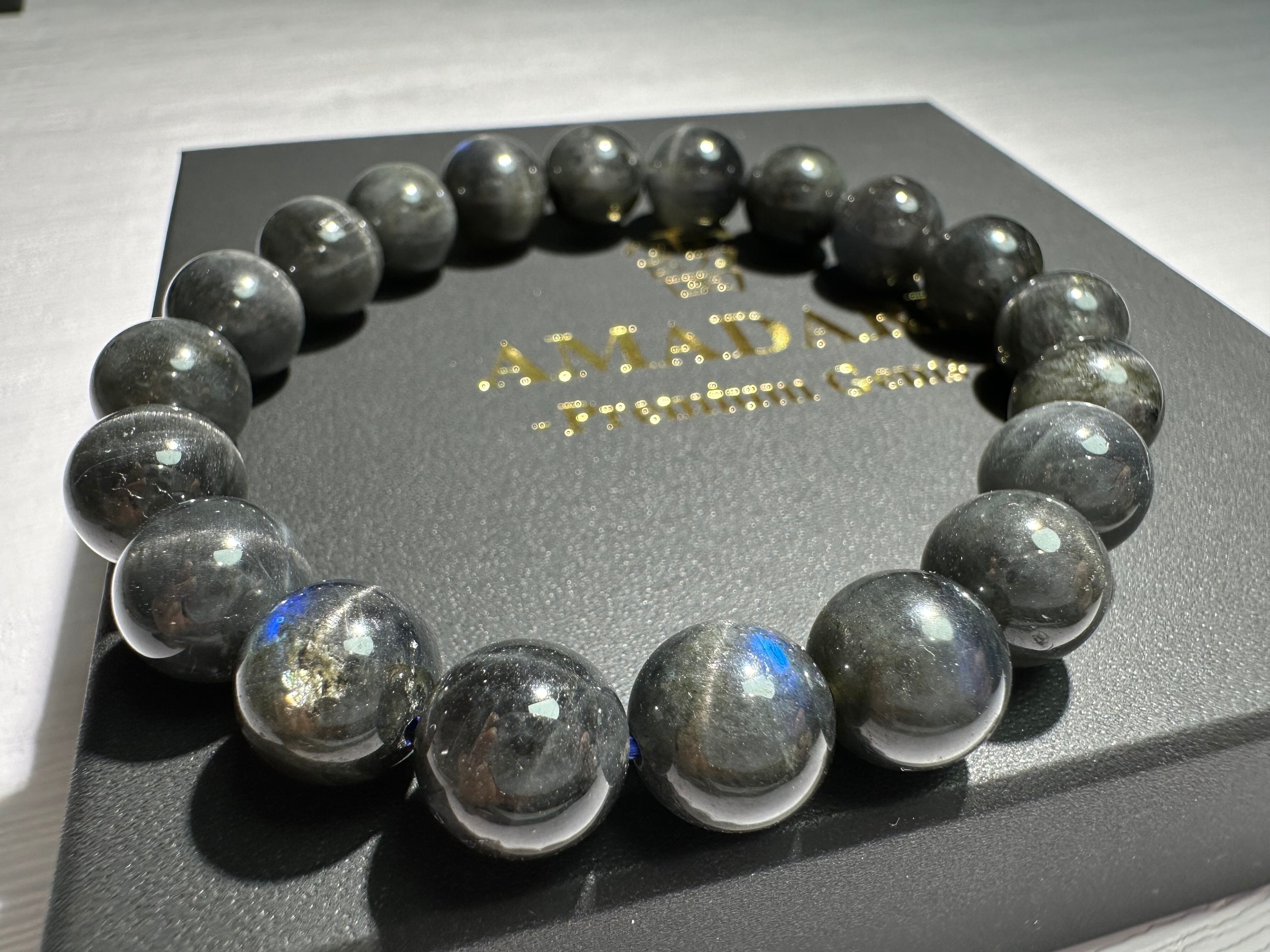 黒ベースの長石に深い青色のシラーが発光するように浮かび上がり、神秘的な美しさがあります。