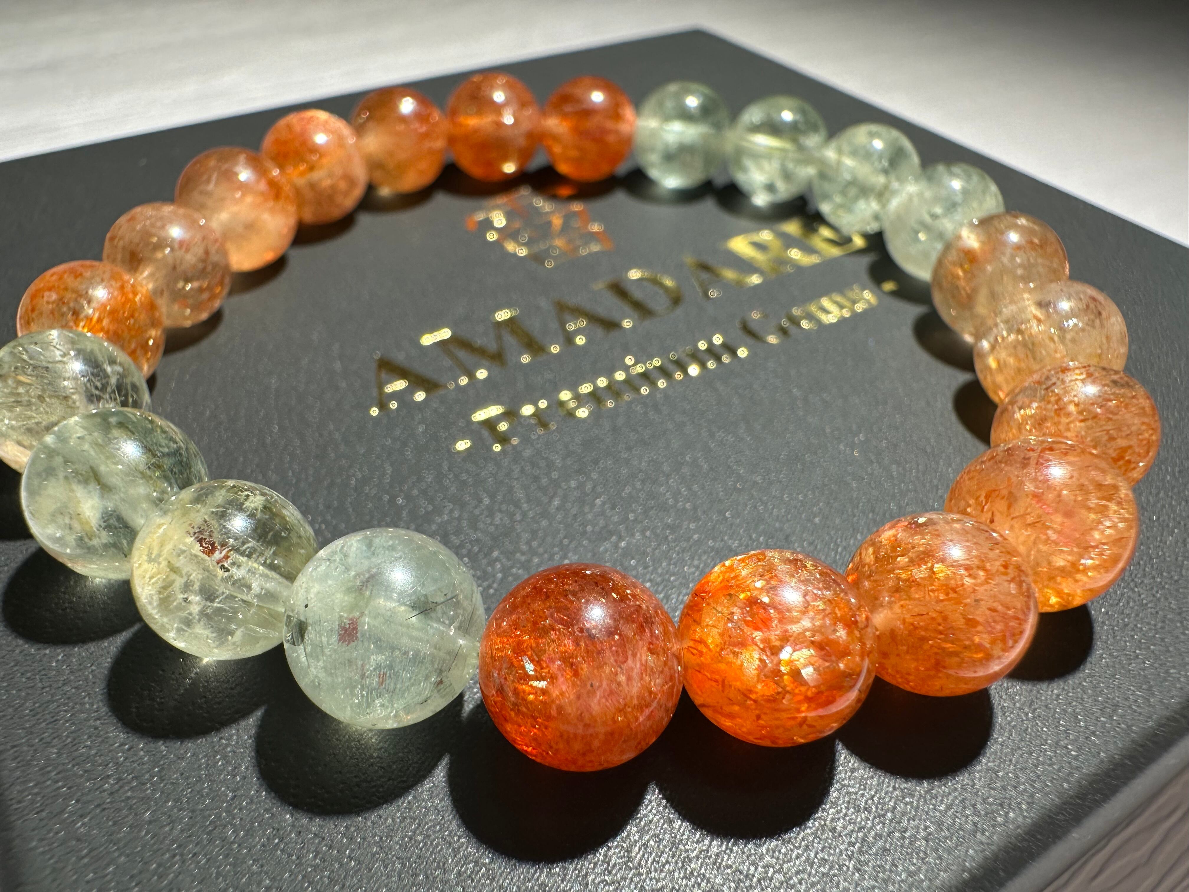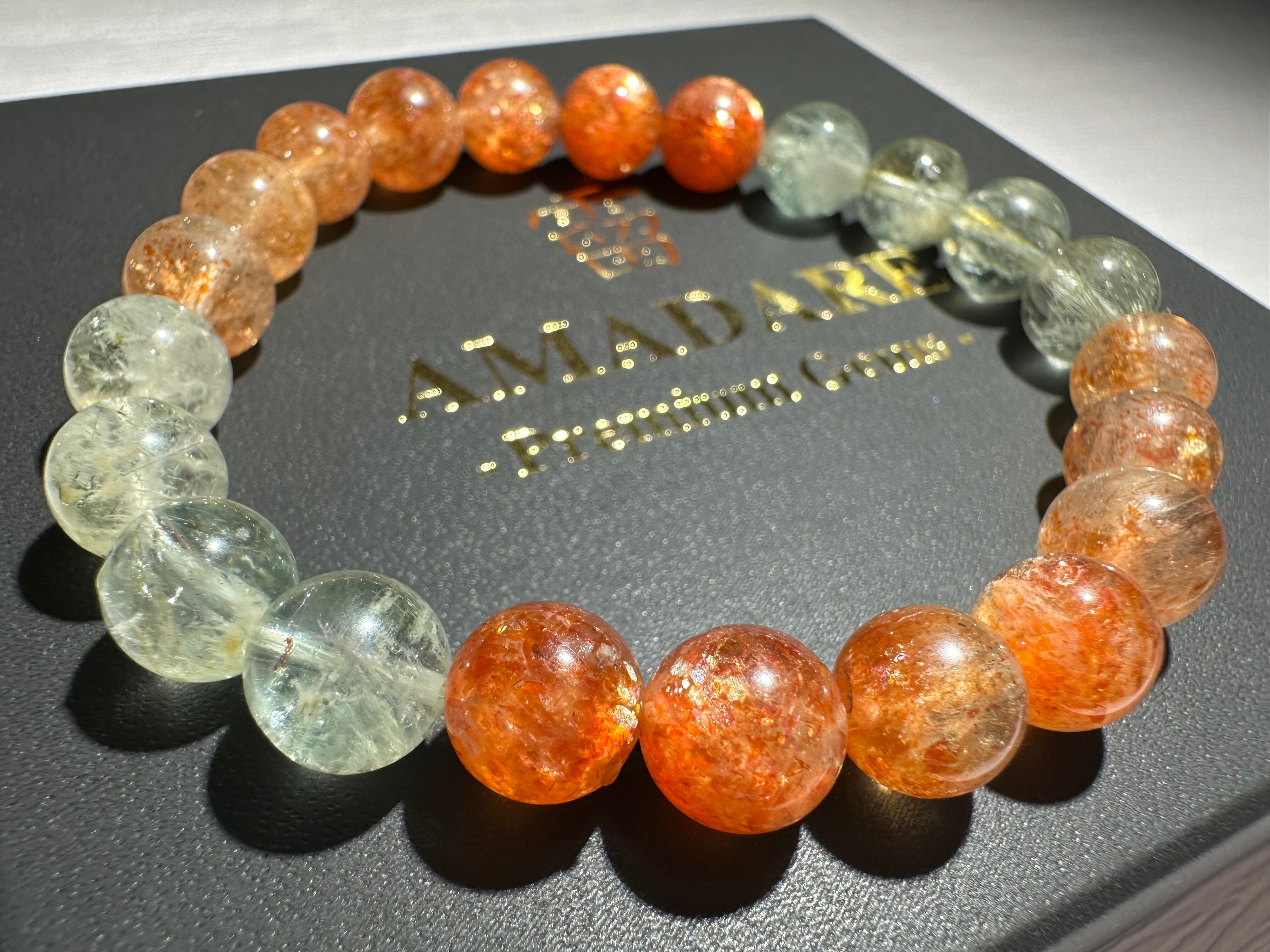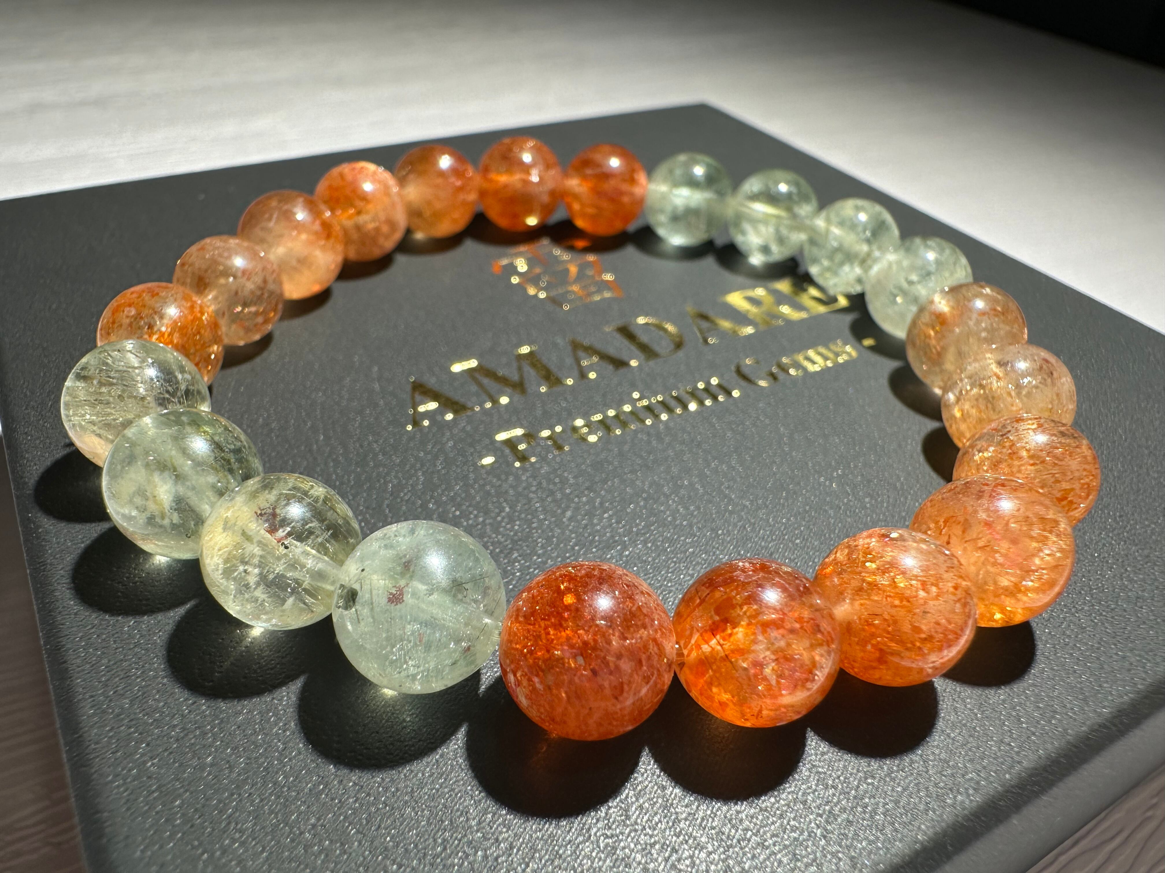 サンストーンといえば鮮やかなオレンジですが、あるーシャはオレンジの他に透き通るようなブルー、グリーン、バイカラーになっていたりと色とりどりなことが特徴です。