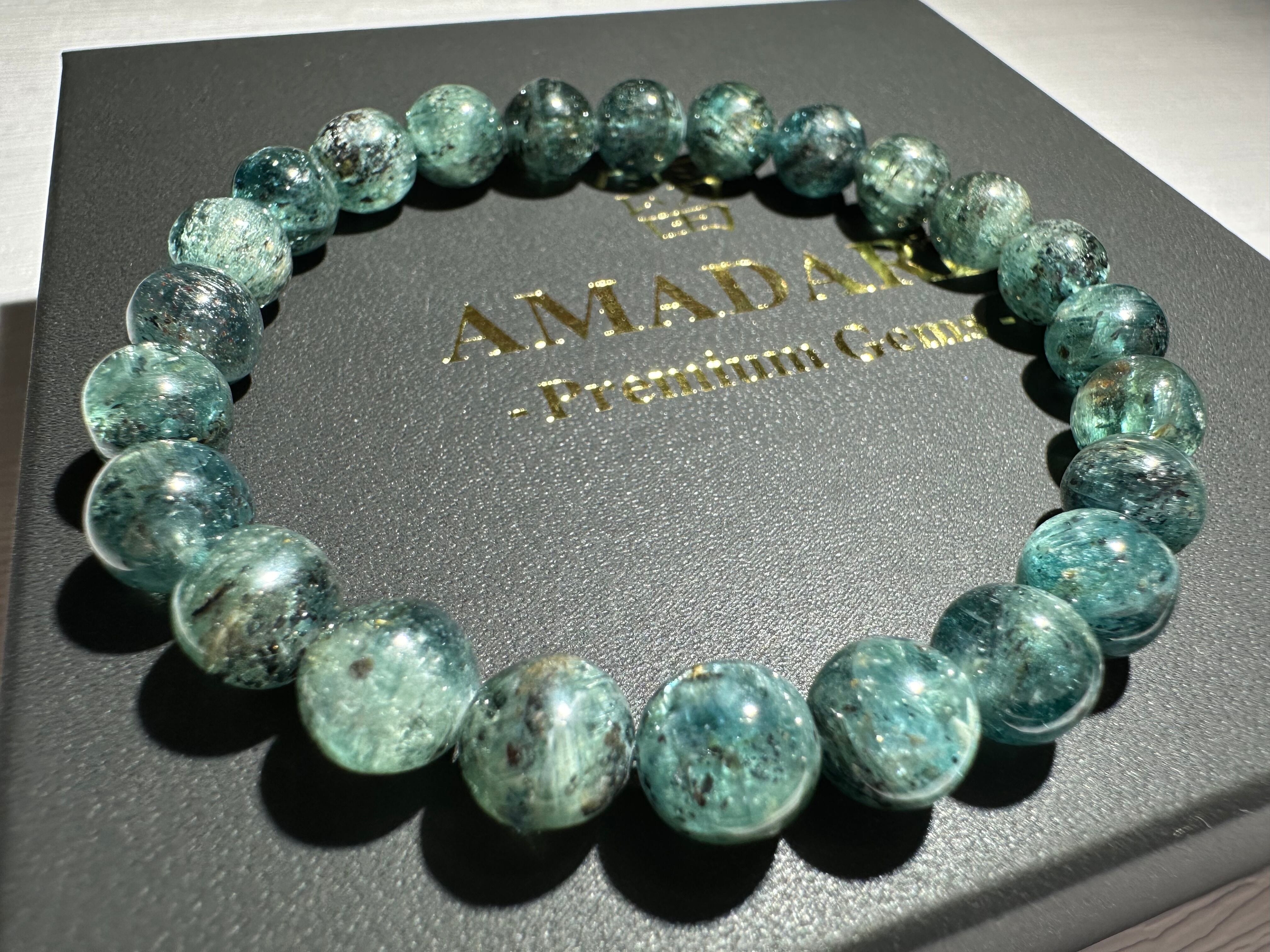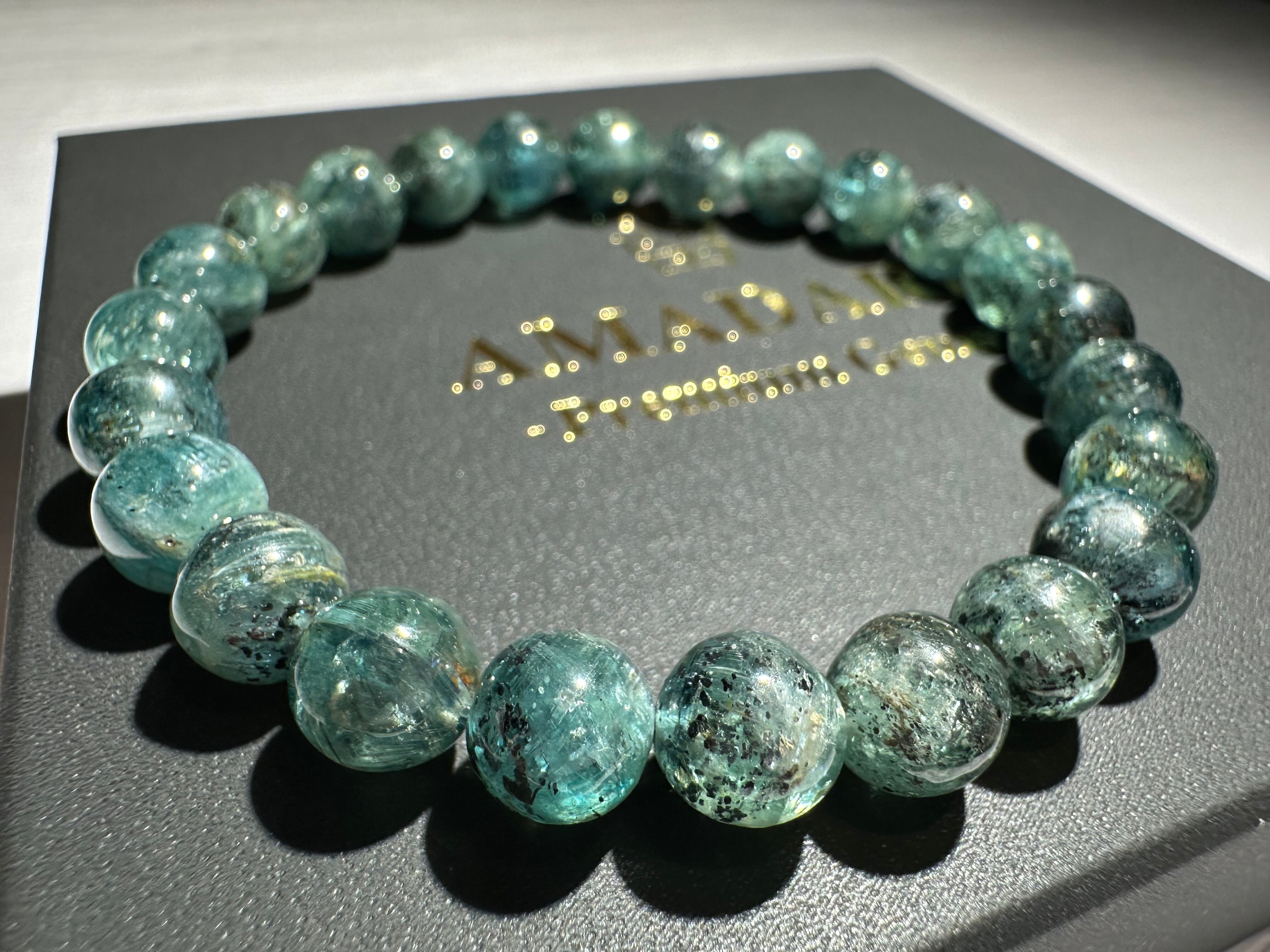 発色もよく透明感も感じられるとともに、透かすとキラキラしていることから、買付現地では「星空グリーンカイヤナイト」と呼ばれています。