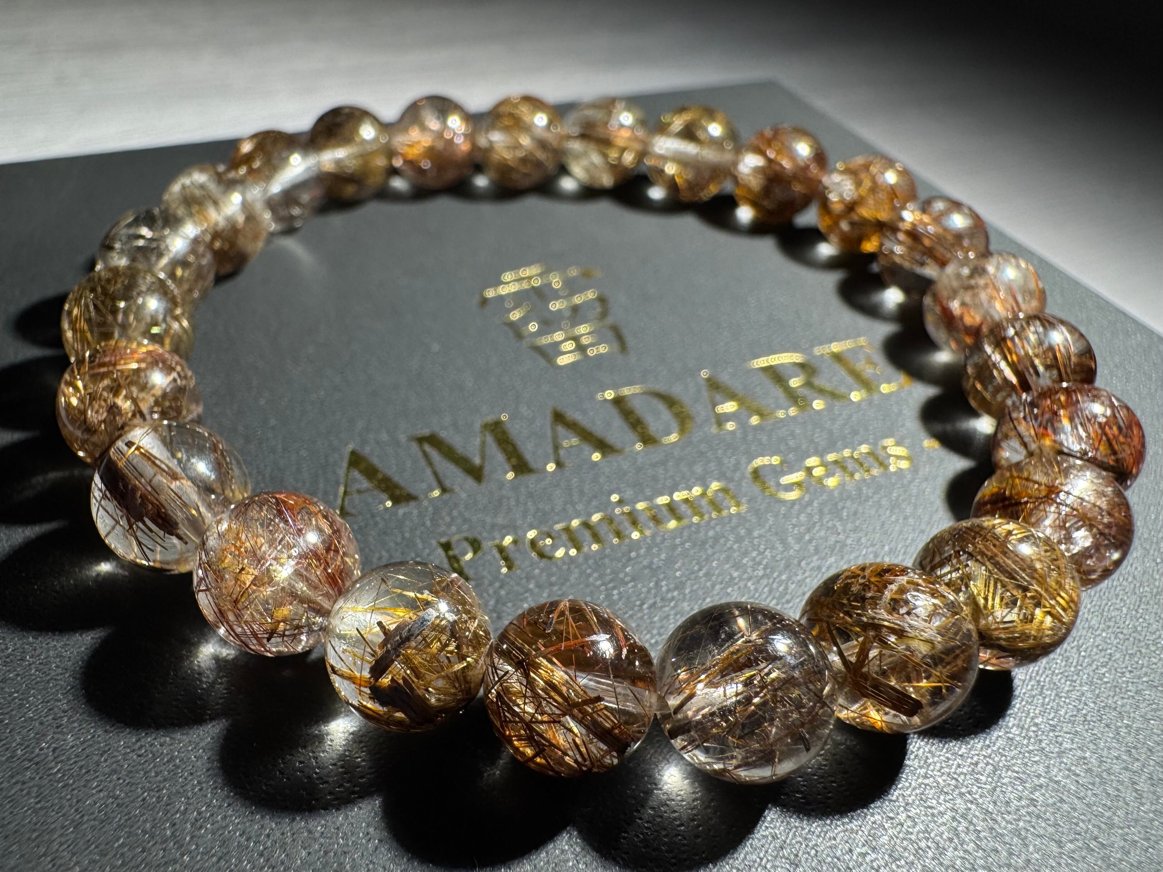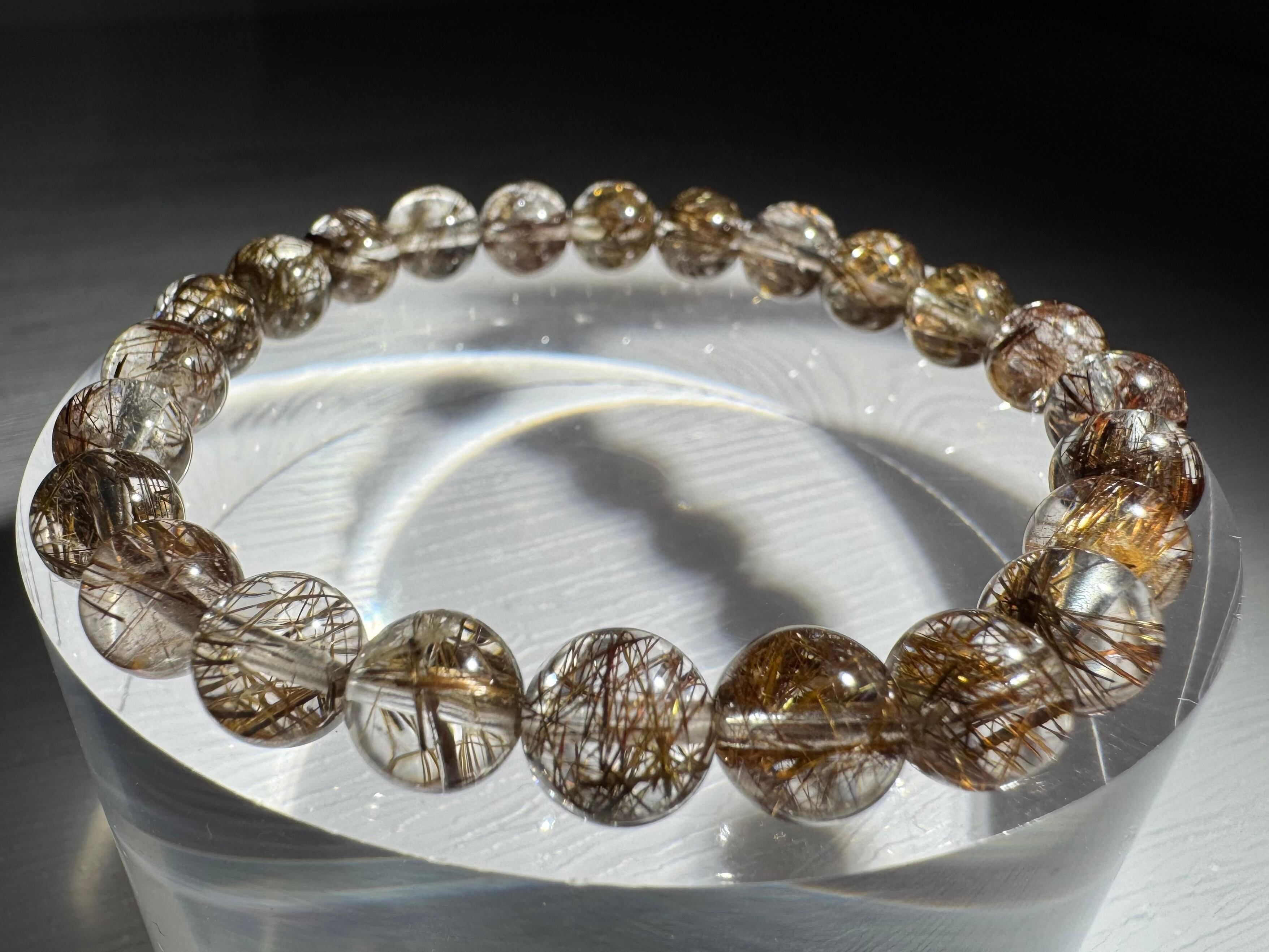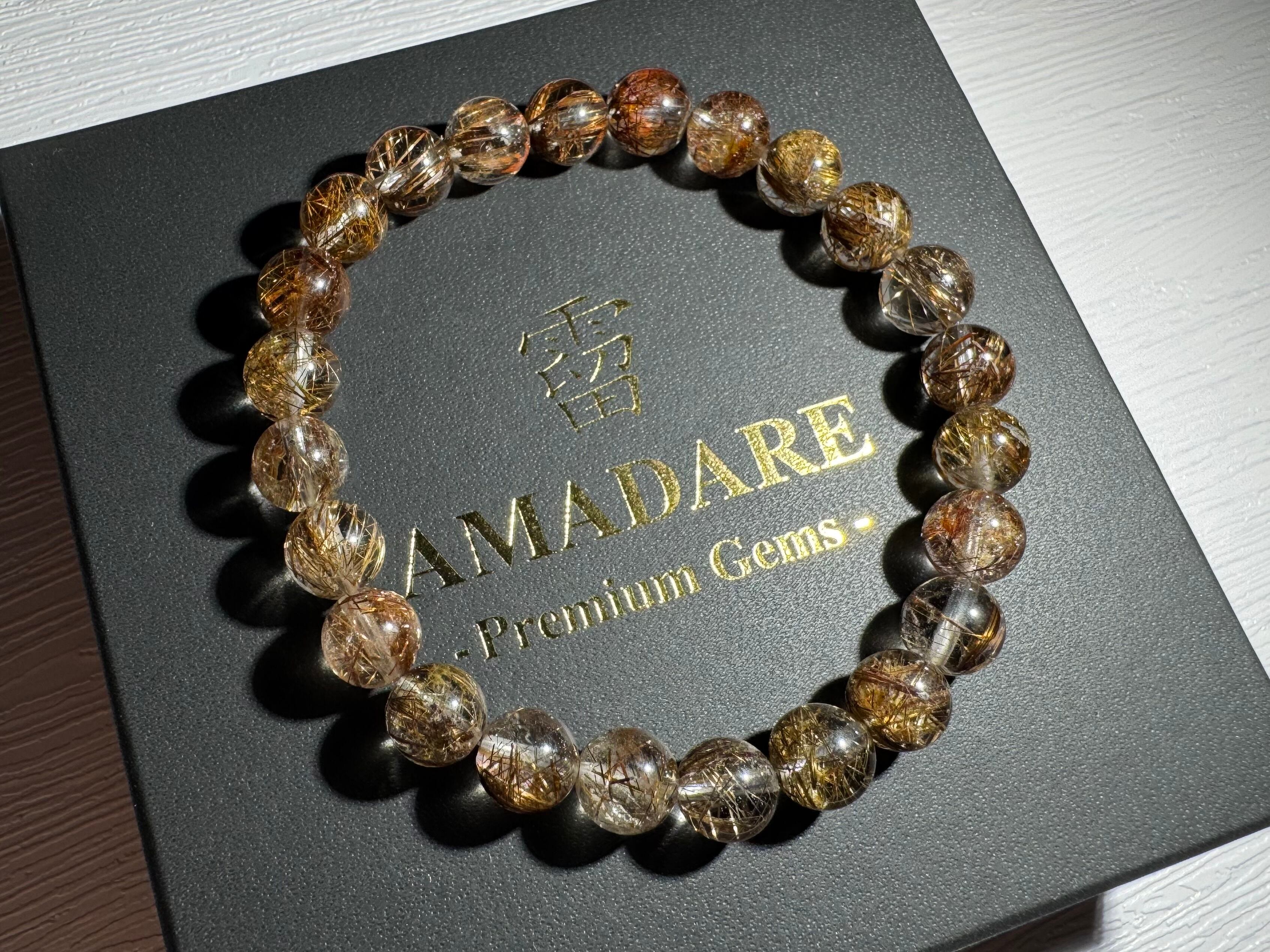 ダークな色合いのコーヒーカラールチルが煌めき、透明感も高く、美しいSグレードコーヒールチルクォーツブレスレットです。